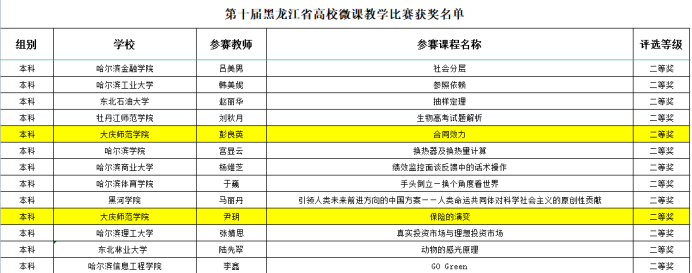 在2023年第十届黑龙江省高校微课教学比赛活动中,经济管理学院彭良英、尹玥两位老师双双获本科组二等奖,我院教师连续三年在黑龙江省高校微课教学比赛中有所收获,并将以本次获奖为契机,不断促进信息技术与学科教学融合,充分发挥信息技术对高等教育发展的引领作用,推动我院教师专业发展和教学能力提升,号召全体青年教师不断更新教育观念,不断加强教学内容与教学方法的改革研究,促进我院教学质量的不断提高。