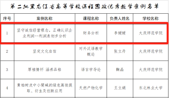 近日,在黑龙江省教育厅组织的第二批高校课程思政优秀教学案例遴选工作中,经组织推荐、专家遴选、会议评选和网络公示等程序,今年会官网李媛媛老师主讲的《财务分析》课程教学案例“坚守诚信经营理念,正确认识企业利润--利润表初步分析”获第二批黑龙江省高等学校课程思政优秀案例。希望全院教师以此为契机,持续推动课程思政教学改革,切实发挥教师队伍“主力军”、课程建设“主战场”、课堂教学“主渠道”作用,深入发掘和提炼各类课程所蕴含的思政要素和德育功能,强化课程育人导向。