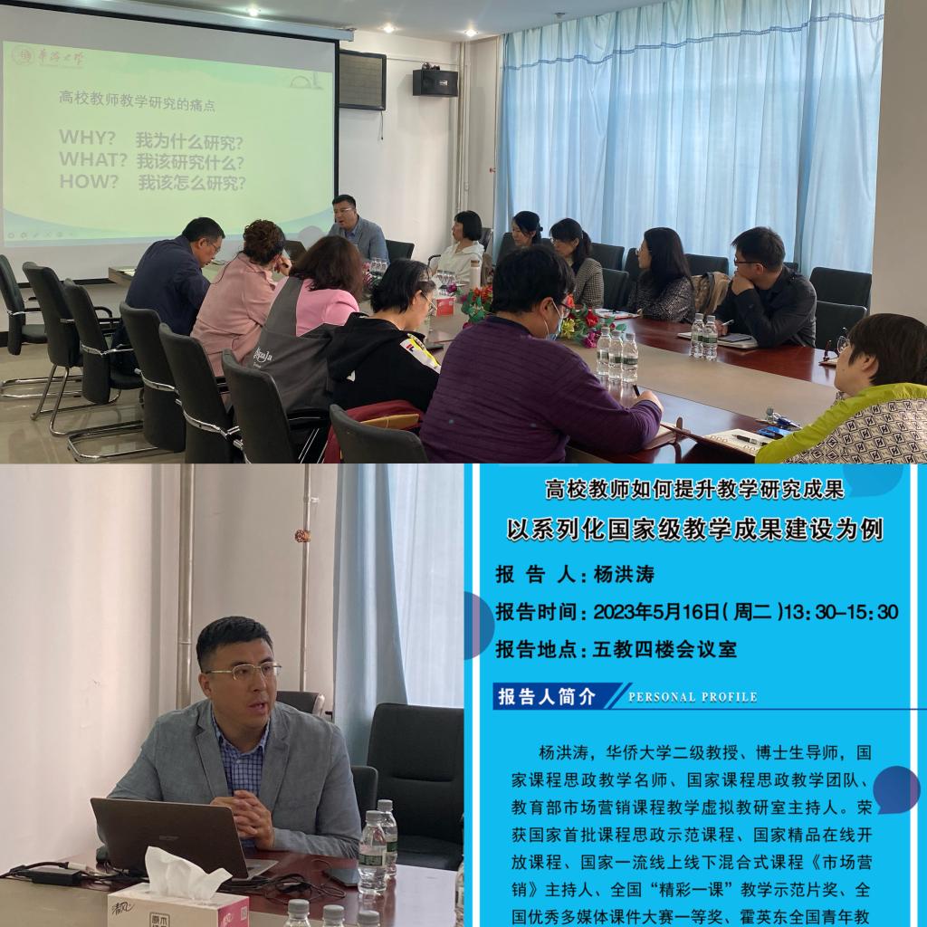 为了进一步有效提升学院课程教学上层次上质量,2023年5月16日学院邀请华侨大学二级教授、博士生导师杨洪涛教授来院进行辅导讲座。上午杨洪涛教授针对学院部分校级课程进行针对性的闭门辅导讲座;下午在五教四楼会议室举行题为“高校教师如何提升教学研究成果:以系列化国家级教学成果建设为例”的专题讲座,本次讲座由今年会官网行政负责人刘楠教授主持,学院全体无课专任教师和兄弟学院部分领导现场聆听。