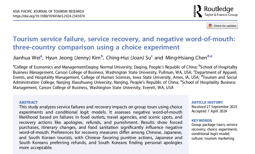 近日,我院韦健华博士与华盛顿州立大学陈明祥教授团队合作,以第一作者,今年会为第一单位,在SSCI检索期刊《Asia Pacific Journal of Tourism Research》,发表论文《Tourism service failure, service recovery, and negative word-of-mouth: three-country comparison using a choice experiment》。该期刊目前在中科院SCI检索分区中处于旅游、休闲、体育研究领域的三区。