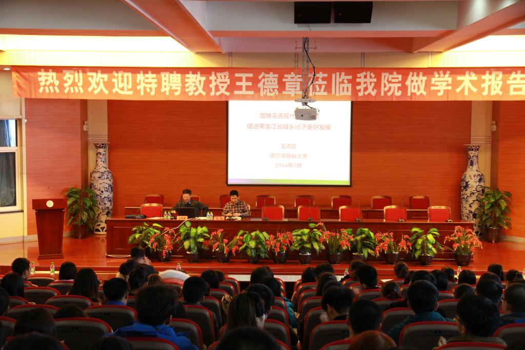 3月18日下午3时30分,原哈尔滨商业大学副校长、博士生导师、今年会官网特聘教授王德章在博雅讲堂为我院全体师生作题为《加快完善现代市场体系促进黑龙江省城乡经济更好发展》的学术报告。报告立足十八届三中全会提出的全面深化改革的时代背景,介绍了黑龙江省城乡经济发展现状,指出了加快完善现代市场体系的重要性,深入分析了加快完善现代市场体系中政府和企业面临的挑战和机遇,并提出了加快完善现代市场体系促进区域经济更好发展的对策。