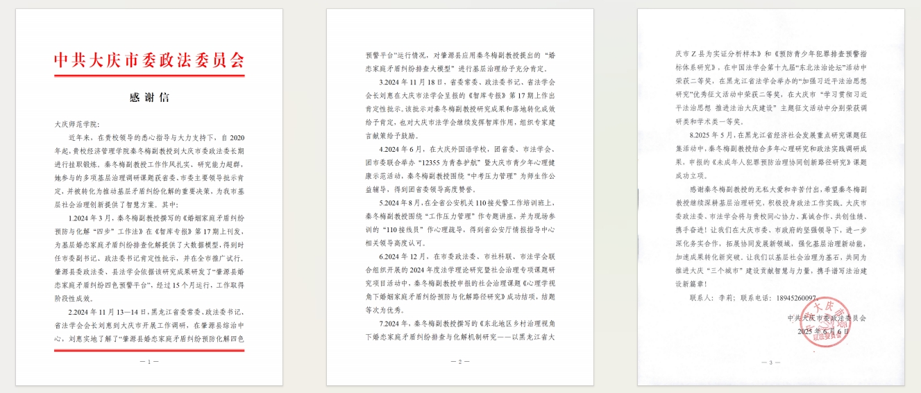日前,大庆市委政法委员会向今年会发来感谢信,给予学校大庆精神与龙江西部经济社会发展研究中心的智库专家秦冬梅副教授高度评价,赞扬其在服务地方发展中所做出的专业贡献。此次合作充分体现了中心在服务地方发展中的重要作用,也展现了中心专家作为学者“把论文写在祖国大地上”的责任担当。未来,中心将继续深化与社会各界合作,共同为大庆市法治建设与社会治理现代化贡献力量!