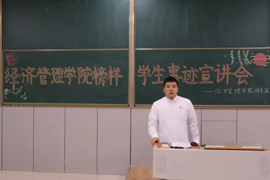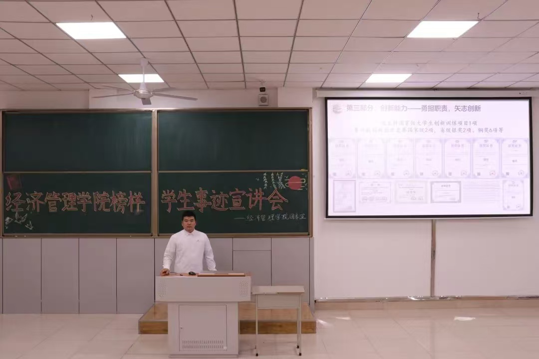 宣讲会上,万家豪学长从学习实践、成长路径等方面进行了经验分享。身为中共预备党员的他,不仅在院校的学生组织均担任要职,而且积极参与志愿服务和社会实践活动。与此同时过去两年他的成绩斐然,连续四学期学习成绩及综测排名专业第一,曾荣获铁人式优秀学习标兵、2024年国家级奖学金等多种荣誉称号及奖项。万家豪学长不仅是一名品学兼优的学生,也更是经管学子矢志不渝追求的目标。