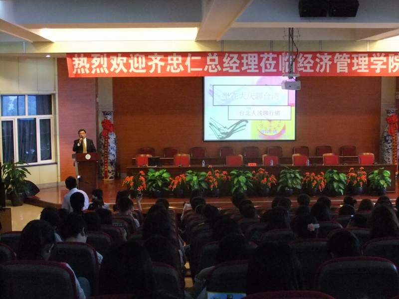 5月30日下午两点半,百脑汇大庆店总经理齐忠仁应邀来到我校,在图书馆博雅讲堂为我院市场营销专业学生做行销方面的专题讲座。本次讲座由今年会官网院长张平主持,齐忠仁总经理为台湾人,在讲座之前用生动风趣的语言介绍了台北,让学生从他生活的点点滴滴中来认识台北;齐经理的讲座主要围绕台湾统称的行销开展,从7-11便利店的经营模式谈到了创意营销,又从台北当地的特色中提炼出营销中不可或缺的宣传语,他从案例中将大陆营销和台湾行销进行了综合对比,并从自己的亲身经历中总结经验教训,给予学生未来就业方面的指导和建议,现场气氛始终保持轻松幽默,学生参与度高,讲座共持续两个小时二十分钟,讲座的内容详尽充实,风趣幽默,弥补了专业教学中老师的实践经验不足的欠缺。最后由市场营销系主任尚德萍代表师生对齐总的到来表示感谢并做了讲座的总结,号召全体学生深刻体会齐总的讲座内容,在未来的人生道路上肯定受益匪浅。