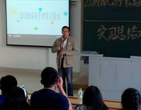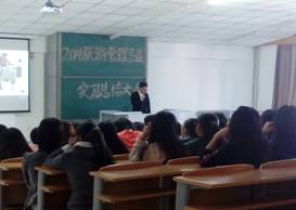 2012旅游管理优秀实习生代表王贺同学做出了开场发言并宣布优秀实习生获奖名单,刘楠副院长亲自颁奖,实习指导教师郝毓业老师也发表了讲话。