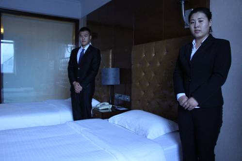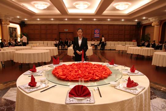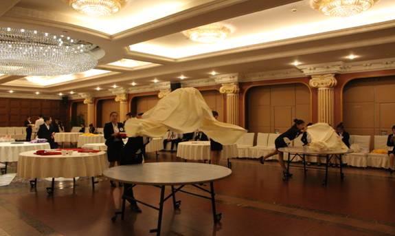 为了提升学生的实践技能,《酒店管理》课程增加了服务技能实训环节。经过三周的紧张准备,2014级旅游管理系《酒店管理》服务技能实训考核于2015年6月28日10:00在新科苑酒店正式考试。2014级旅游管理专业1、2、3、4班129名学生,分组参加餐饮部、客房部服务技能实训考核。评委老师由旅游管理系教师和酒店部门经理主管组成。餐饮部101名学生进行分台编号,9张餐台同时进行比拼,主要考核铺置台布、骨碟定位、三杯及筷子筷架摆放、口布花折叠、操作规范及熟练程度。客房部28名学生分四组同时进行中式铺床和卫生间清洁,主要考核拉床、甩单定位、包角、套被套枕套、被子铺置、操作规范及效果;垃圾清扫、面盆、镜面及恭桶清洁、物品陈列、时间控制。经过上下午将近4个小时的紧张激烈比拼,最终评选出一等奖9名,二等奖11名,三等奖15名。
