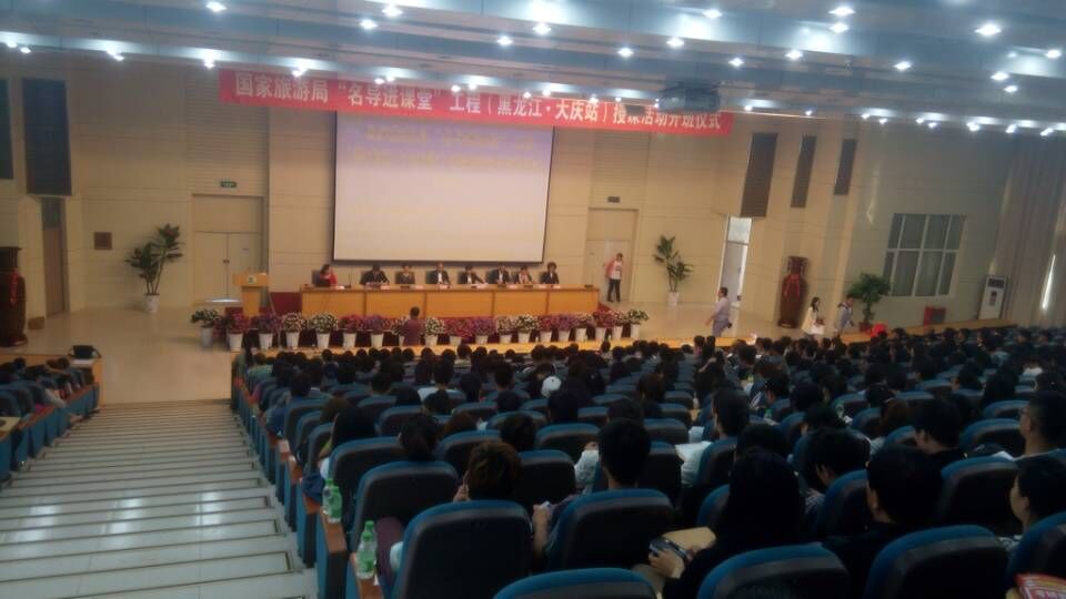 2015年9月15-16日,在今年会主楼百湖讲堂召开了国家旅游局“名导进课堂”(黑龙江·大庆站)专题讲座。黑龙江省旅游局领导、大庆市旅游局领导、培训中心人员,全市具有导游资格证人员以及我校旅游管理专业师生参加了本次培训讲座。