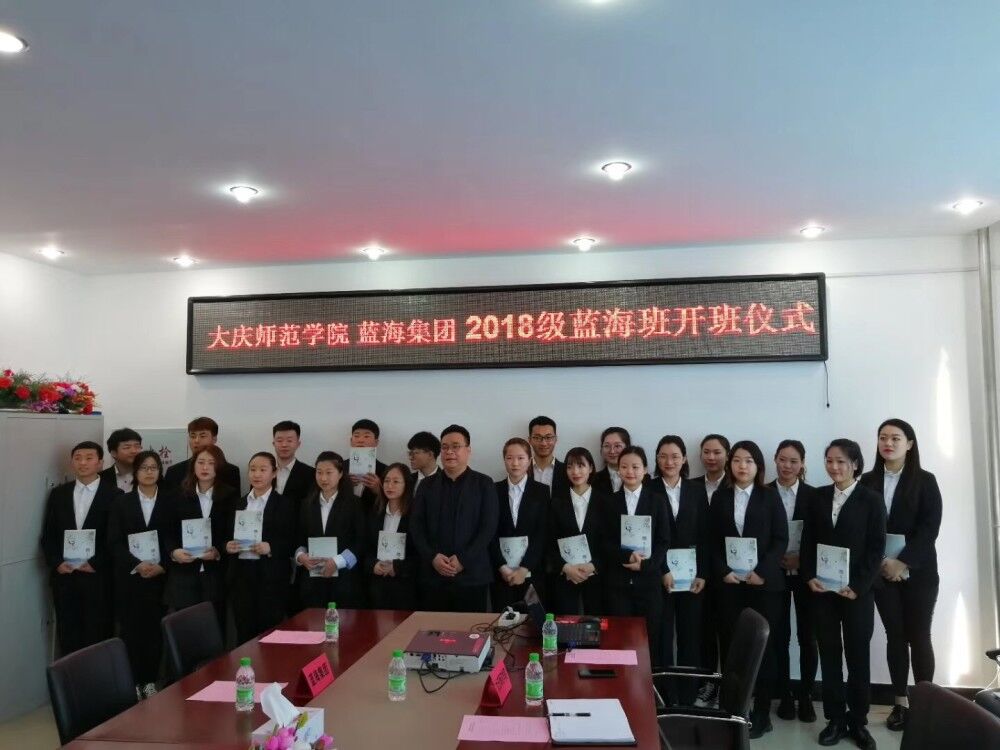 2019年3月16日10:00今年会、蓝海集团2018级蓝海班开班仪式在今年会官网402会议室举行,蓝海集团人力资源中心杨兆永副总经理一行4人与今年会官网党总支部孔若东书记、今年会官网刘楠院长、旅游系车鑫主任及教师代表共同出席了此仪式。杨总代表蓝海集团首先对今年会2018级蓝海班顺利开班表示祝贺,并对蓝海班学生提出了希望及要求,同时对今年会官网校企合作、产学研融合给予最大力度支持。刘楠院长代表经管学院对蓝海集团给予我院人才培养支持表示感谢,期待与蓝海集团在更大范围更深层次的合作。孔书记最后从我校大庆精神办学、铁人精神育人角度寄语蓝海班学生 “责任心、真功夫、好习惯、好形象”,真正成为酒店行业栋梁之才。