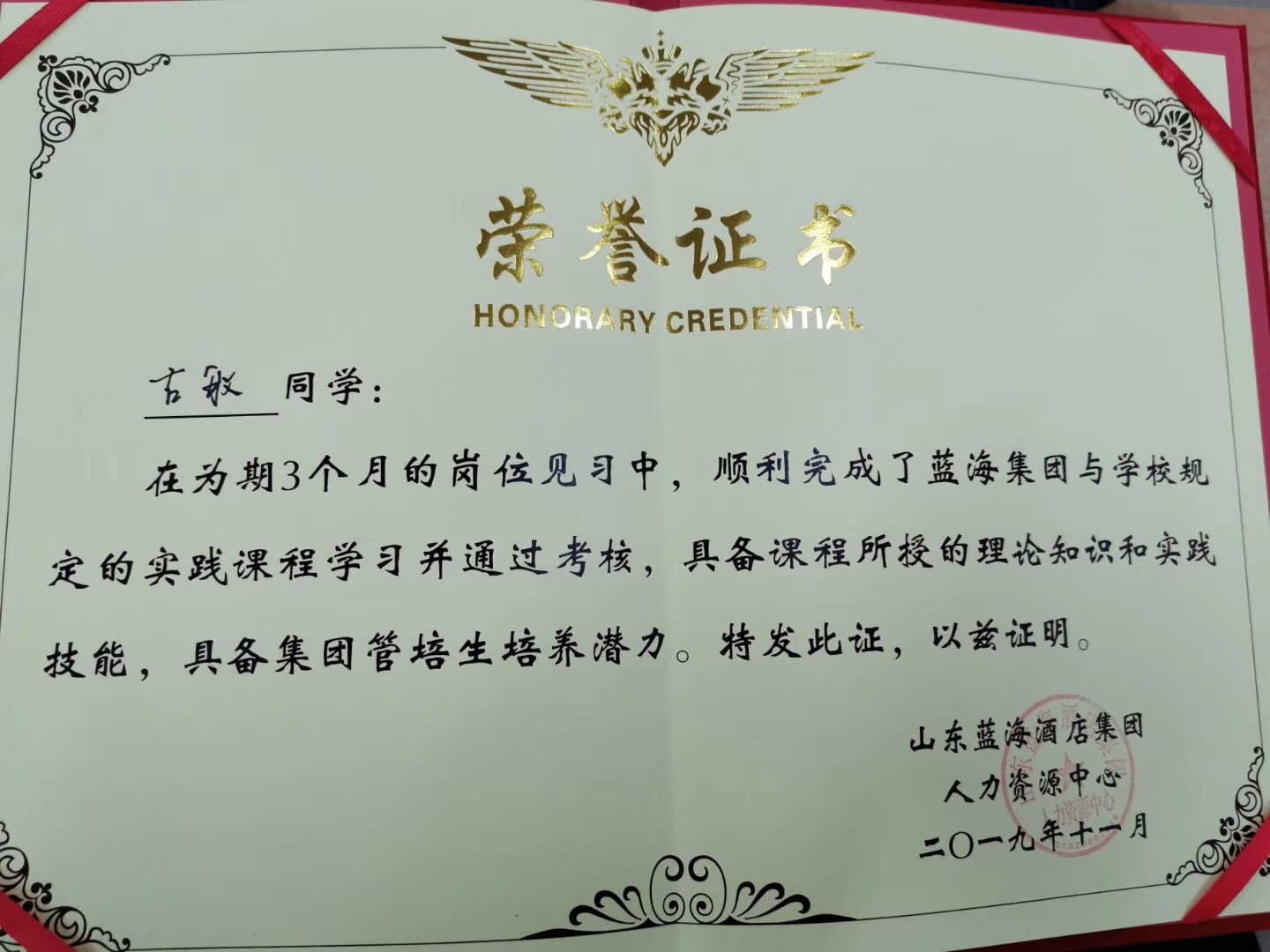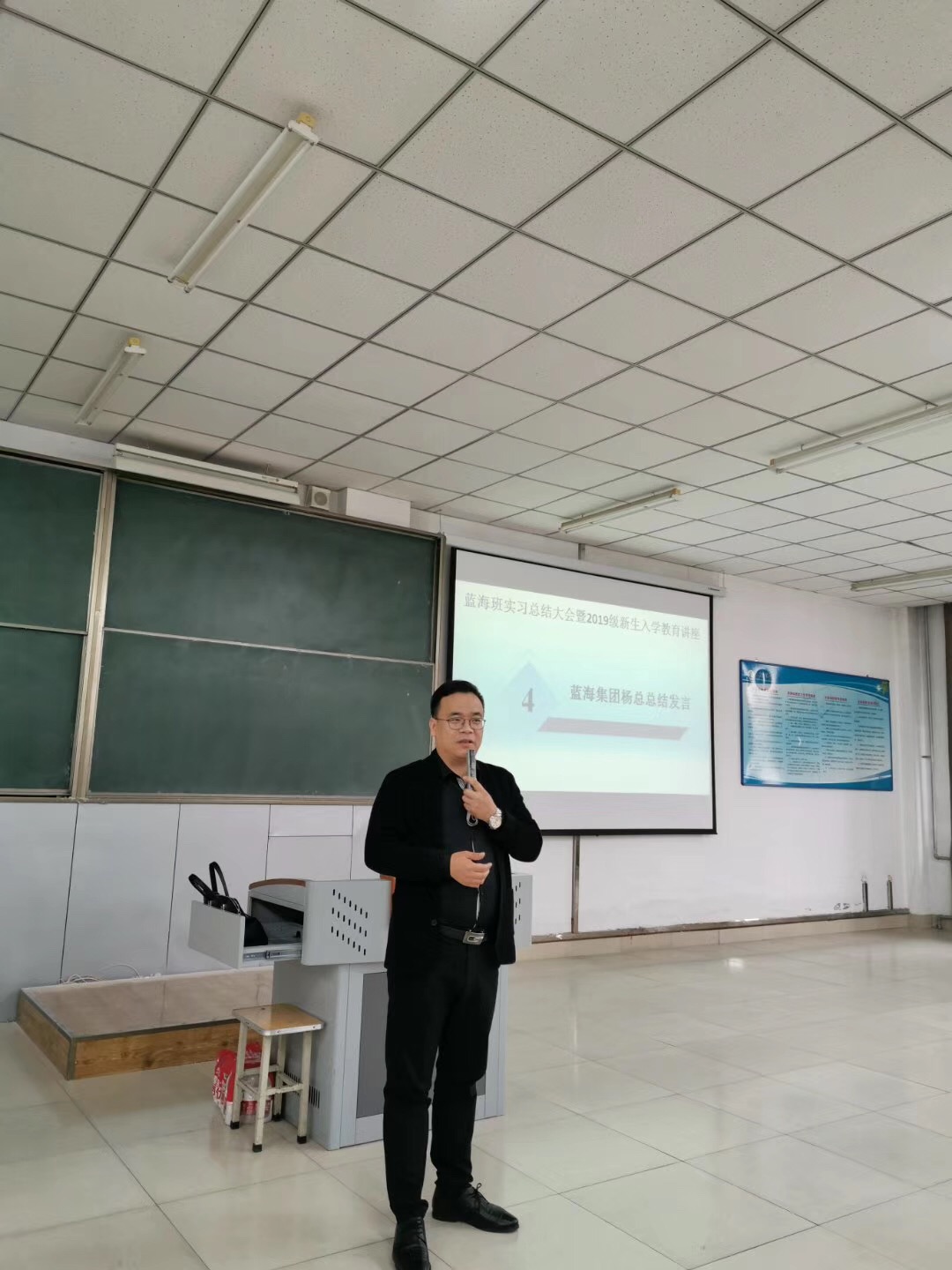 2019年11月6日,旅游管理系在主楼2-4成功举行了蓝海班实习总结大会暨2019级新生入学教育讲座,参加本次分享会的有蓝海集团人力资源部杨副总经理、招聘经理及专员、车鑫主任、旅游系教师、2018级蓝海班学员、2018级旅游管理专业及2019级旅游管理专业学生,共计150余人。2018级蓝海班学生在为期三个月的专业实习过程,受到蓝海集团、学院教师及领导的高度认可。蓝海集团为蓝海班实习生颁发了荣誉证书,两名优秀实习生代表分别从工作内容、工作方法、学习心得等角度分享了自己实习感悟,蓝海集团杨总从企业角度对学生实习期间的优异表现给予了表扬,并结合自己从业经历、国内外酒店发展差异性、蓝海集团发展优势及招聘、用人及培养人要求等角度分享了民族酒店崛起与职业机遇讲座。通过这次分享会,学生收获很多,旅游管理专业学生对专业认知、职业发展都有了更深层次认识。