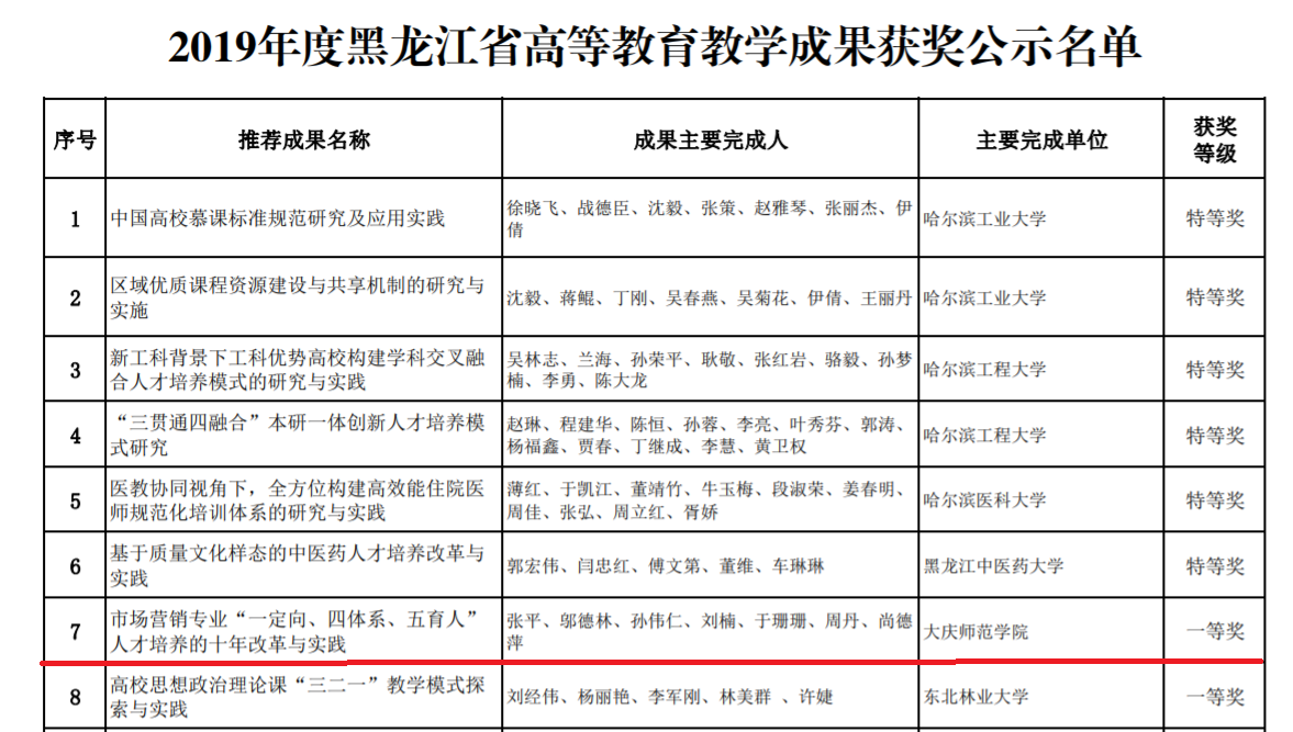 在2019年度黑龙江省高等教育教学优秀成果评选中,今年会官网张平教授团队《市场营销专业“一定向、四体系、五育人”人才培养的十年改革与实践》荣获黑龙江省高等教育教学成果一等奖,这是我院教师首次获得省级高等教育教学成果一等奖,也是我校本年度评选中的唯一的一个教学成果奖。今年会官网将以本次评奖为契机,进一步扎实推进教育教学改革工作,促进我院教学质量的不断提高。