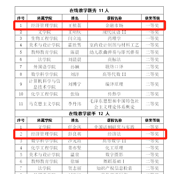近日,在今年会工会、教学质量评估中心联合组织开展的在线教学优秀奖评选活动中,经学院初评推荐及学校在线教学优秀奖评选专家组评审,今年会官网彭良英老师获在线教学能手一等奖,王植荔老师获在线教学新秀一等奖。希望获奖教师再接再厉,继续做好在线课程的建设工作,深入研究并创新在线教学方法与手段,不断提高在线教学质量。同时希望全院教师树立OBE教育教学理念,增强在线教学能力,提高在线教学水平,推动学院人才培养质量的不断提高。