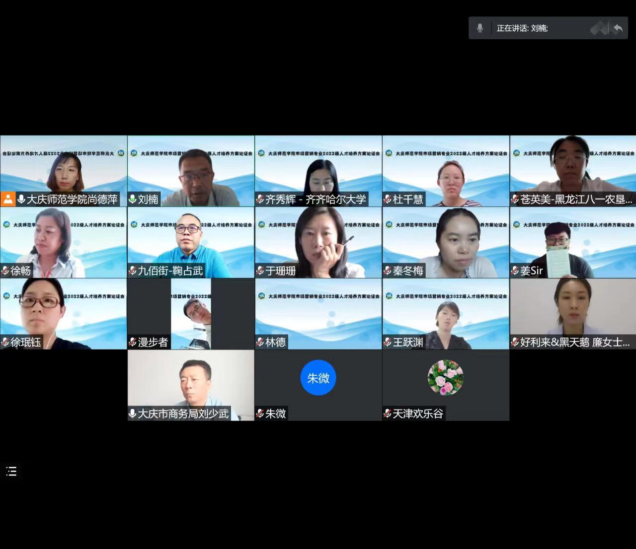 2022年7月15日13:30-15:30,市场营销系召开了2022级人才培养方案论证会,会议采用腾讯会议的方式,邀请了政府、合作企业和高校的专家10位,大庆市商务局电子商务科科长刘少武、齐齐哈尔大学市场营销系主任齐秀辉、东北石油大学营销与旅游系主任徐畅、黑龙江八一农垦大学市场营销系主任苍英美、北京巨量引擎网络技术有限公司巨量部于珊珊、北京市好利来&黑天鹅餐饮管理有限公司招聘部负责人廉美琦、天津欢乐谷人事部经理刘喆、哈尔滨润牛商业有限公司人力资源部主任王雪、大庆九佰街网络科技有限公司董事长鞠占武10专家和今年会官网行政负责人刘楠、教学负责人李媛媛、科研负责人孙伟仁以及市场营销系全体教师参加了论证会,会议由市场营销系主任尚德萍主持。
