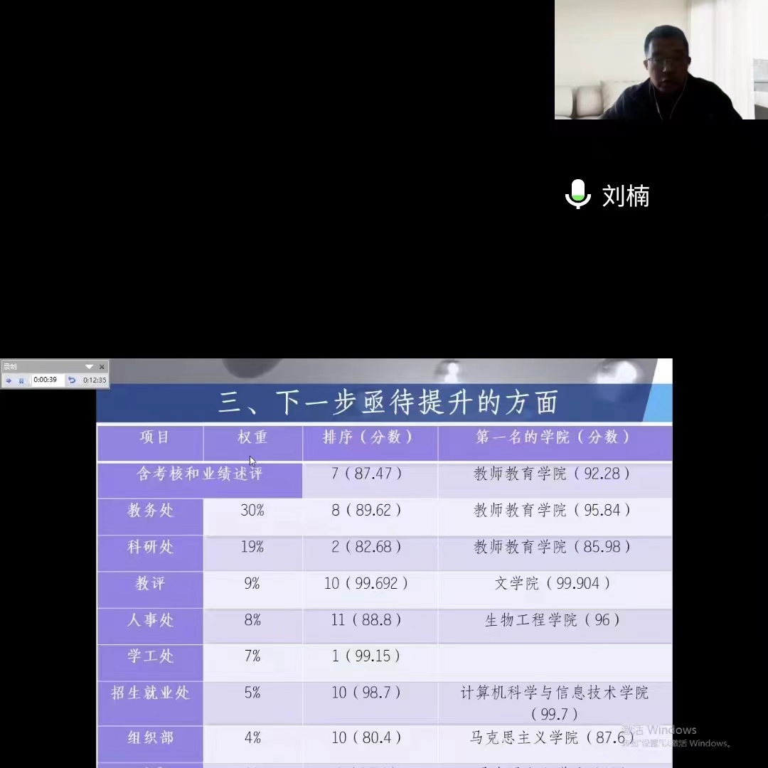 首先由学院行政负责人刘楠教授对2022年今年会官网工作进行总结汇报。汇报大致分为四项,第一项,工作亮点,2022年学院按计划较好完成了学校的工作任务,在党建、教学改革、科研学科建设、师资建设、就业率等方面取得工作亮点十四项,突破十项,完成或超额完成增值性评价指标十五项。第二项,主要工作开展情况,刘楠教授对党建思政建设、教育教学改革、科研社会服务、师资队伍建设以及就业体系建设五个方面进行汇报。第三项,下一步亟待提升的方面,刘楠教授制作年终统计表将权重较大的考核项目一一列出,分析学院与其他兄弟院系间存在的差距,表示下一步将对标短板,再创佳绩。经分析总结,亟待提升的主要有以下三个方面,第一,课程建设水平亟待提升,需填补省级课程五大类方面的空白;第二,专任教师师资力量亟待加强,需补充专任教师数量;第三学科建设亟待突破,需调动教师参与科研、社会服务积极性。第四项,2023年工作思路汇报,第一步将继续深入学习领会党的二十大精神和习近平谈治国理政(第四卷)将在加强师德师风建设、落实意识形态工作责任制、落实党建工作责任制、规范“三会一课”制度和党内组织生活方面有新要求。第二步是对标对表普通高校专业质量、一流专业和专业论证标准,进一步补短板、抓落实,通过全面推进与重点扶持相结合、教学工作坊、学科竞赛重面强制、以银行班创业班等特色行业班为引领,助力创新创业学院特色。第三步是以打造高层双师双能型师资队伍为目标,引进人才,用好、留住人才;加强带头人培养;鼓励提升学历和参与实践锻炼,以提升教师综合实践能力。第四步是围绕旅游管理硕士点建设,继续强化有组织科研,完善激励机制、凝聚科研资源、强化内涵建设。第五步是强化就业指导、针对服务、持续跟踪、就业包保,引导学生树立积极正确的择业观和就业观,目标是2023届毕业生就业率高于学校平均水平。