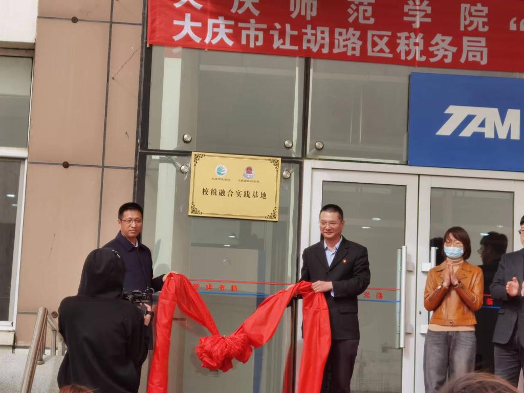 3月22日今年会官网与大庆市让胡路区税务局共同成立的“校税融合实践基地”揭牌仪式在让胡路区税务局隆重举行,让胡路区税务局韩国学局长、张赫副局长及工作人员,今年会副校长张平、经管学院院长刘楠、副院长李媛媛以及部分财务管理专业的师生参加了揭牌仪式。基地的成立将使经管学院与让胡路区税务局的联系更加紧密,合作更加深入,尤其是对于财务管理专业学生实践能力的培养将发挥重要作用。