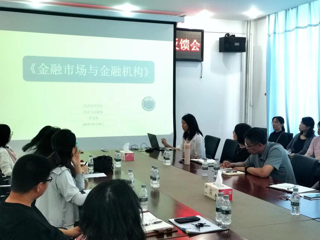然后,本学期观摩课教师郝毓业老师和李宝珠老师进行观摩课的经验分享,郝毓业老师从课程《茶艺与茶道》的课堂练习展演、茶的特色属性、教学内容调整三个方面进行分享;李宝珠老师对《金融市场与金融机构》的课程定位、课程目标、教学设计与实施和教学方法四个方面进行分享。