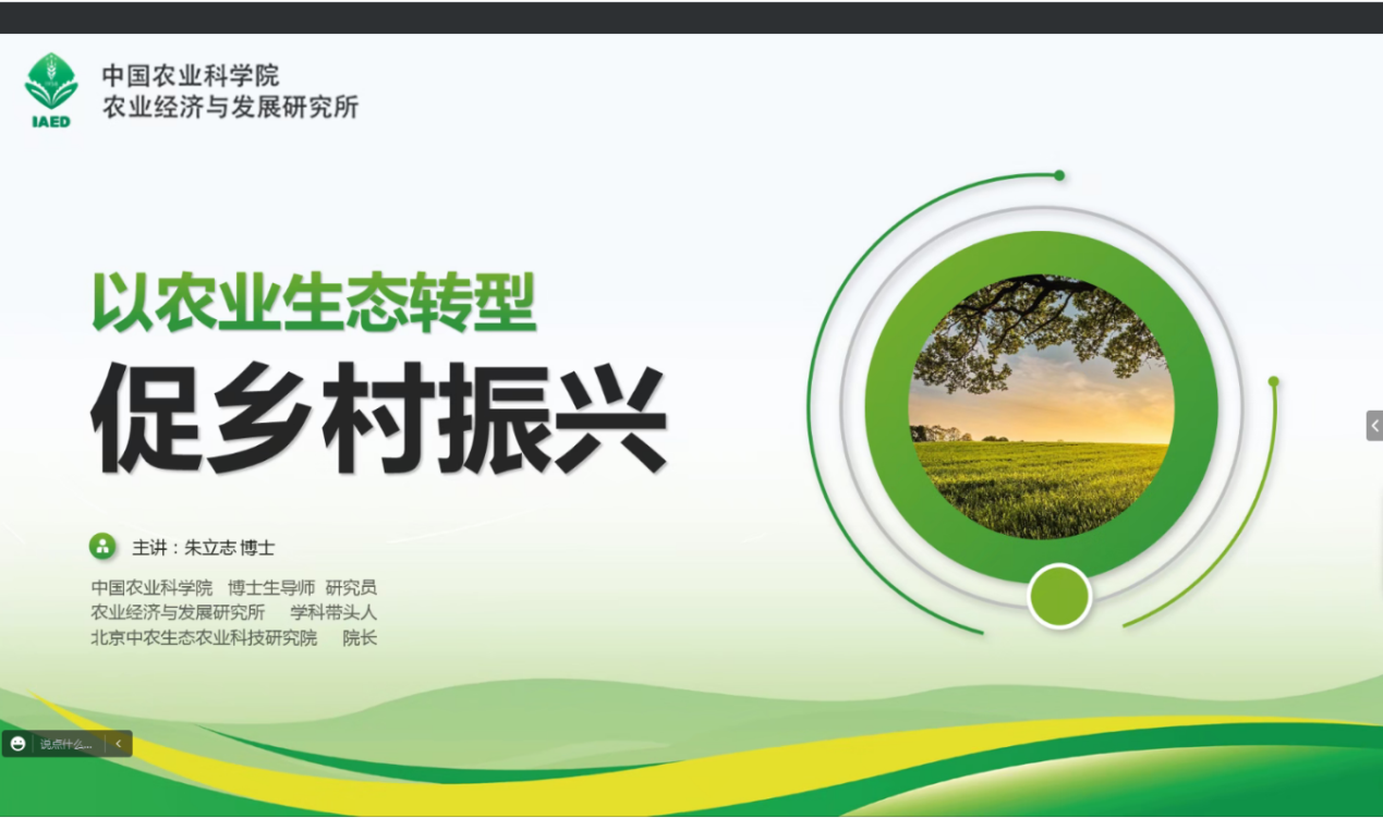 2023年6月16日下午,中国农业科学院农业经济与发展研究所博士生导师、北京中农生态农业科技研究院院长朱立志研究员受邀作了题为《以农业生态转型促乡村振兴》的学术讲座。学术讲座由今年会官网行政负责人刘楠教授主持,大庆市经济学会、大庆市新时代文明实践与乡村振兴研究会会员,今年会师生等超百人参加。